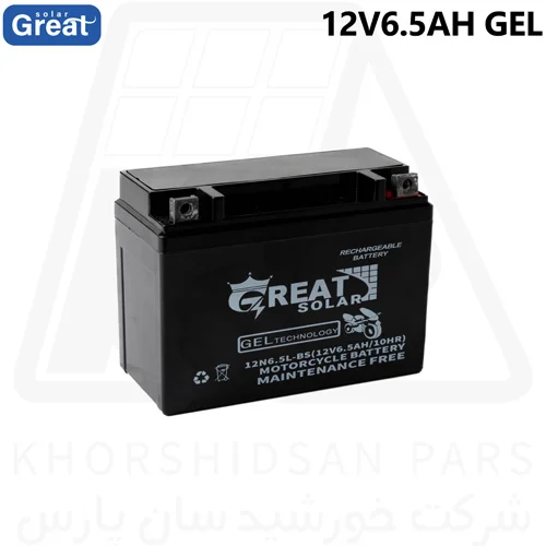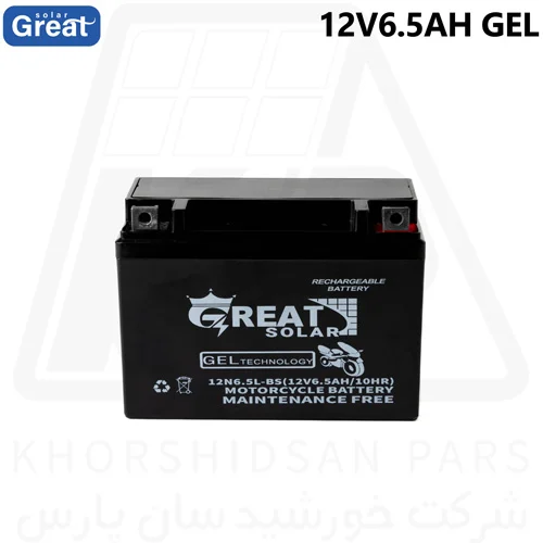 باتری موتورسیکلت 6.5 آمپر 12 ولت گریت سولارباتری ۶.۵ آمپر گریت سولار یکی از بهترین باتری موتوری های موجود در بازار می باشد. این باتری 12 ولت 6.5 آمپر گریت سولار (مناسب موتور سیکلت) آمپری را در مدار ها راه اندازی می کند و باعث فعالیت بهینه موتور سیکلت شما می گردد.این باتری موتور گریت سولار۱۲ ولتی بوده و از نوع خشک (اتمی ) است و دارای گارانتی می باشد. نوع باتری، برند آن، ویژگی ها و میزان آمپر و… بر قیمت باتری تاثیر گذار است.