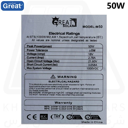 گارانتی توان خروجی پنل خورشیدی 50 وات گریت سولار
