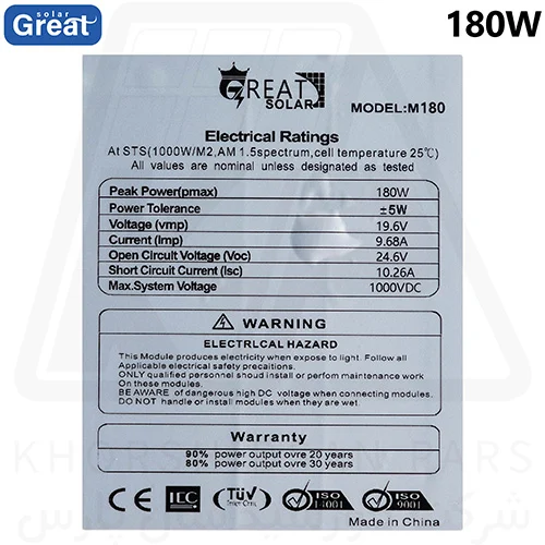 گارانتی توان خروجی پنل خورشیدی 180 وات گریت سولار